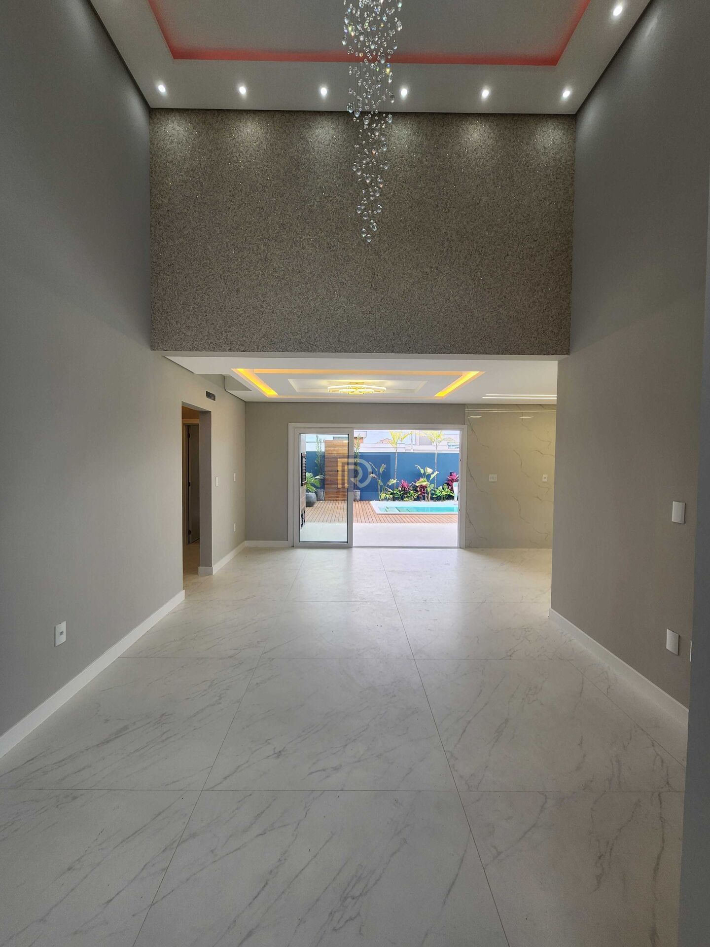 - O pé direito elevado com um lustre elegante traz imponência e luminosidade ao ambiente. A área social é um verdadeiro espetáculo: espaço gourmet com churrasqueira, lavabo moderno e uma piscina em fibra com cascata que transforma qualquer dia em um feriado particular.